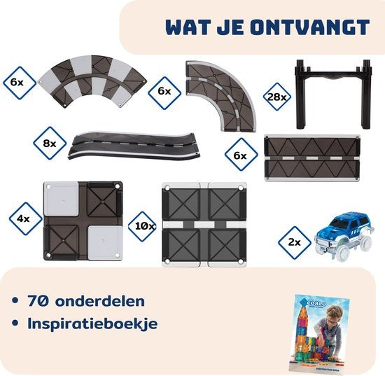 • Inhoud: 12x bocht | 8x verhogende baan | 14x korte baan | 6x lange baan| 28x steunpilaar | 2x raceauto