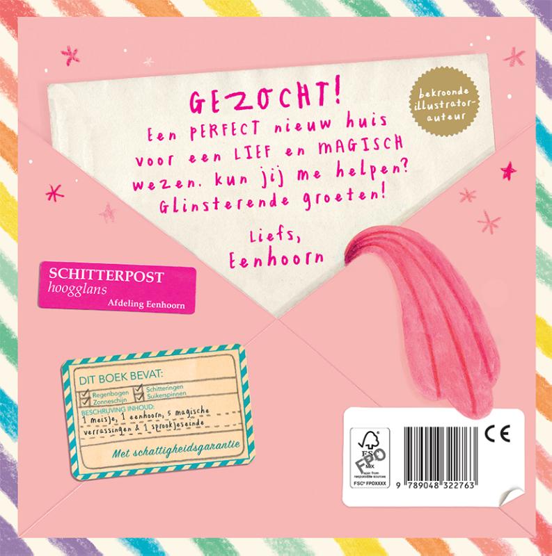 GEZOCHT! Een PERFECT nieuw huis voor een LIEF en MAGISCH wezen. Kun jij me helpen? Glinsterende groeten! Liefs, Eenhoorn Op een dag vol regenbogen vindt een klein meisje een eenhoorn die op de deur van haar boomhut klopt. De eenhoorn moet verdwaald zijn! Gelukkig weet het meisje precies wat ze moet doen. Samen bezoeken ze plekken in de stad om te zien of ze het huis van de eenhoorn kunnen vinden. Van de dierenwinkel tot de kermis. En misschien ontdekken ze wel dat het perfecte huis veel dichterbij is dan ze dachten. Een betoverend boek over een meisje en een eenhoorn, met 5 magische verrassingen om te openen!