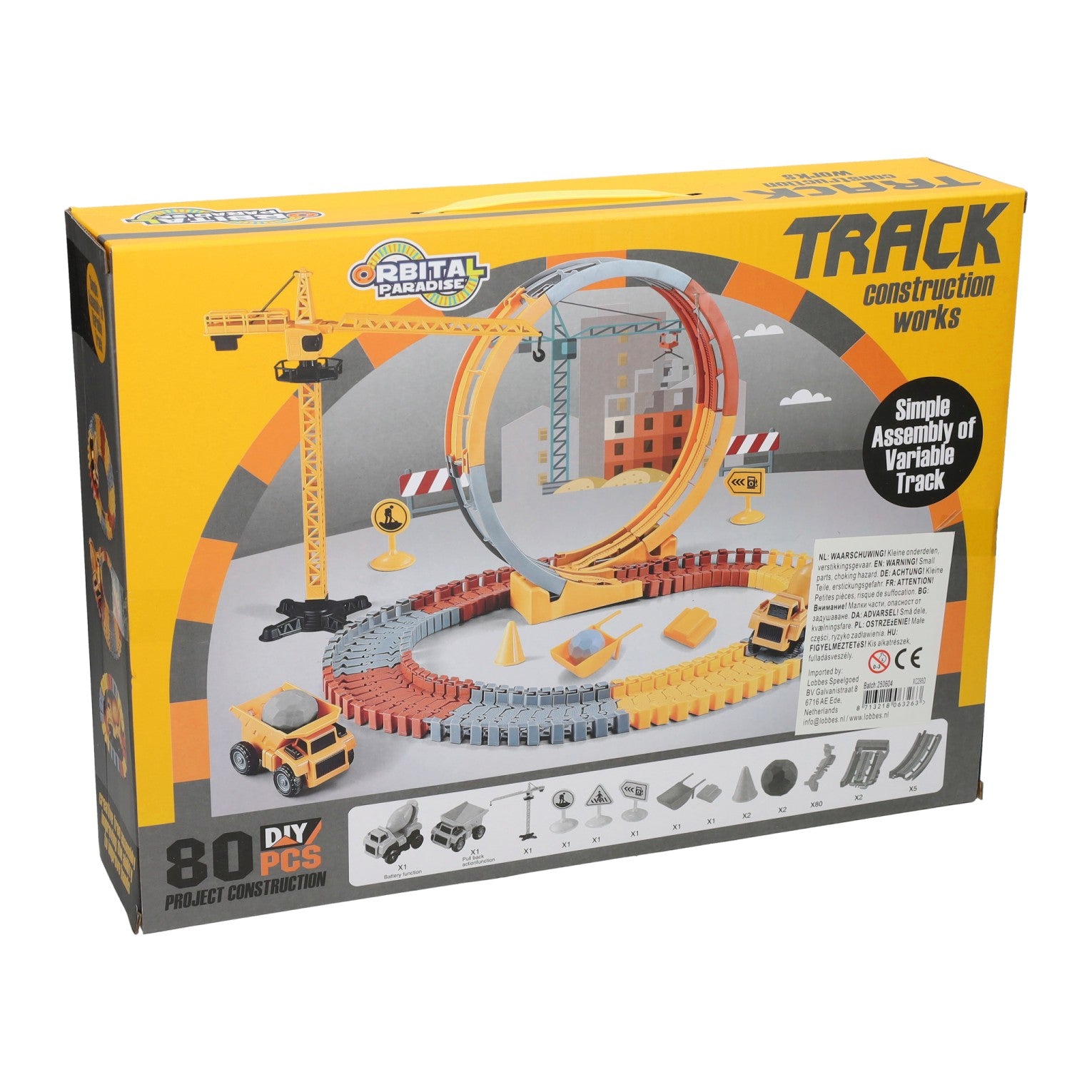 Deze bouwset  bestaat uit kunststof baanstukken, een kraan, voertuigen en verkeersborden. De flexibele track is eenvoudig in elkaar te zetten en bevat een opvallende looping. Geschikt voor kinderen vanaf 3 jaar oud.