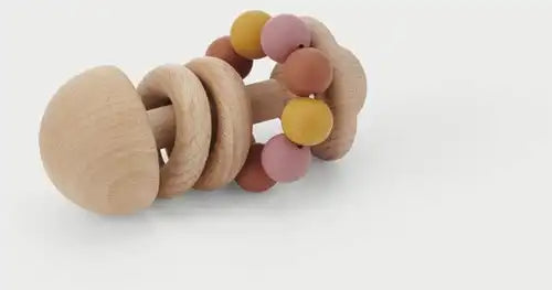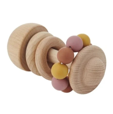 Massief beukenhouten rammelaar met houten ringen en tactiele siliconen kralen voor extra zintuiglijke verkenning en behendigheid.