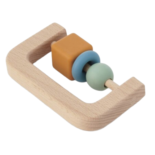 Massieve beukenhouten rammelaar met 3 siliconen kralen in verschillende vormen om een eenvoudige, gemakkelijk vast te houden rammelaar te creëren.