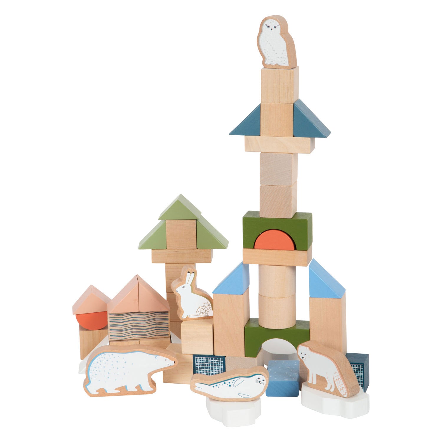 Een klassieker met een moderne twist! Deze set bouwstenen gemaakt van FSC® 100%-gecertificeerd hout maakt grote indruk op jonge, ambitieuze poolonderzoekers met een grote keuze aan houten bouwstenen met verschillende vormen en designs. Naast de gekleurde en natuurlijke houten bouwstenen bevat deze uitgebreide set ook vijf dierenfiguren en stenen met poolpatronen. De hoogtepunten van deze set zijn de twee houten ijsschotsen die tot de verbeelding spreken en het vertellen van verhalen tijdens het spelen aanmoedigen.