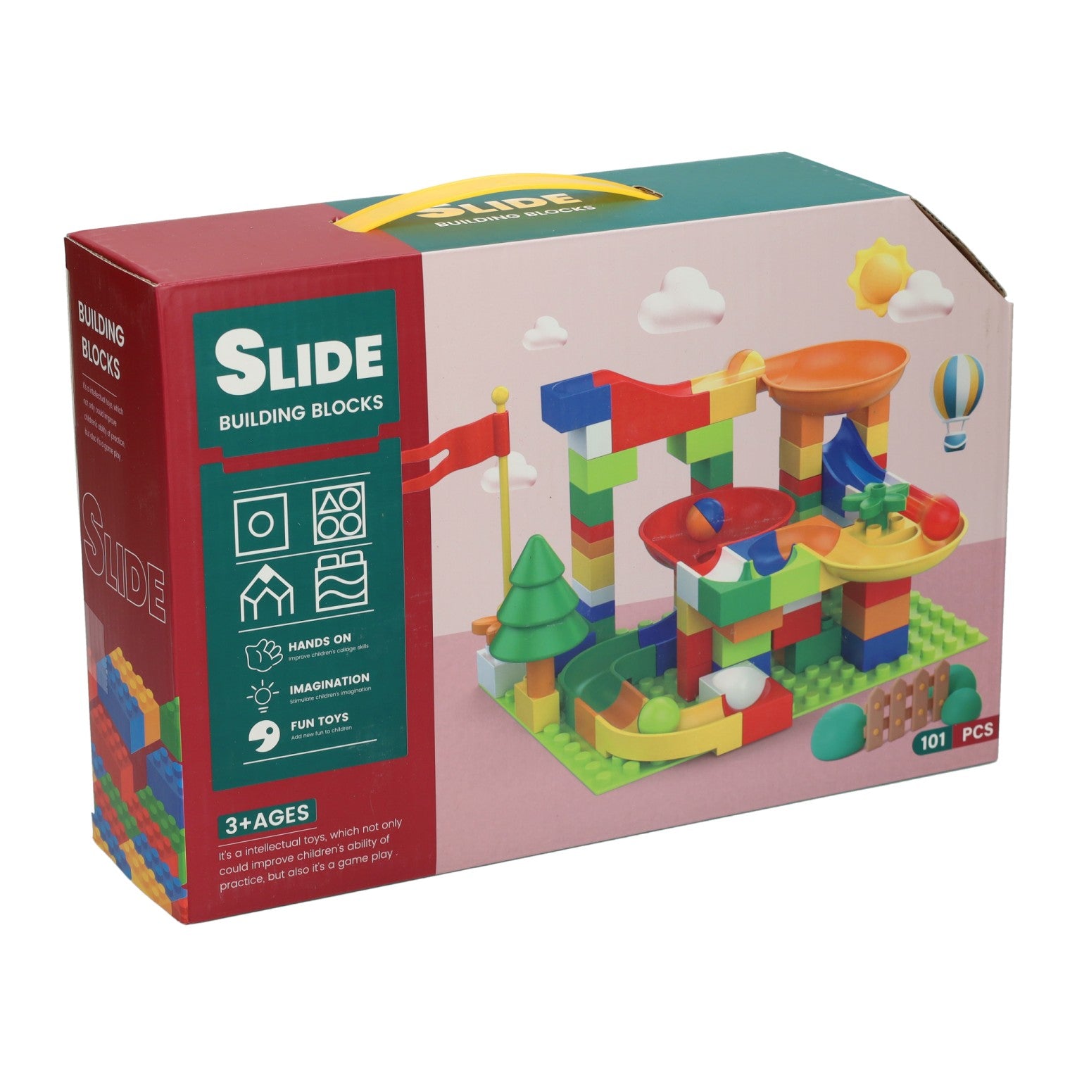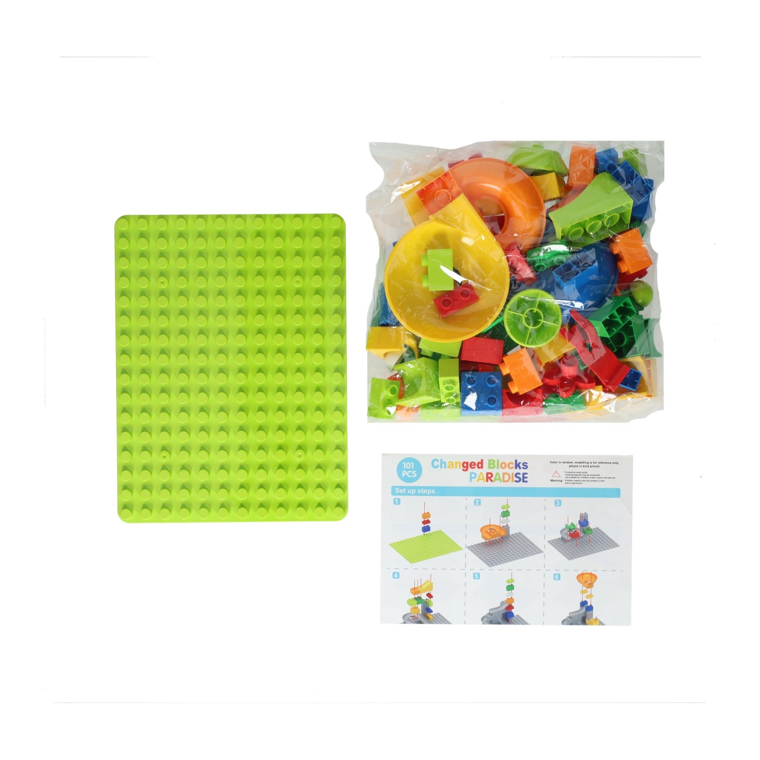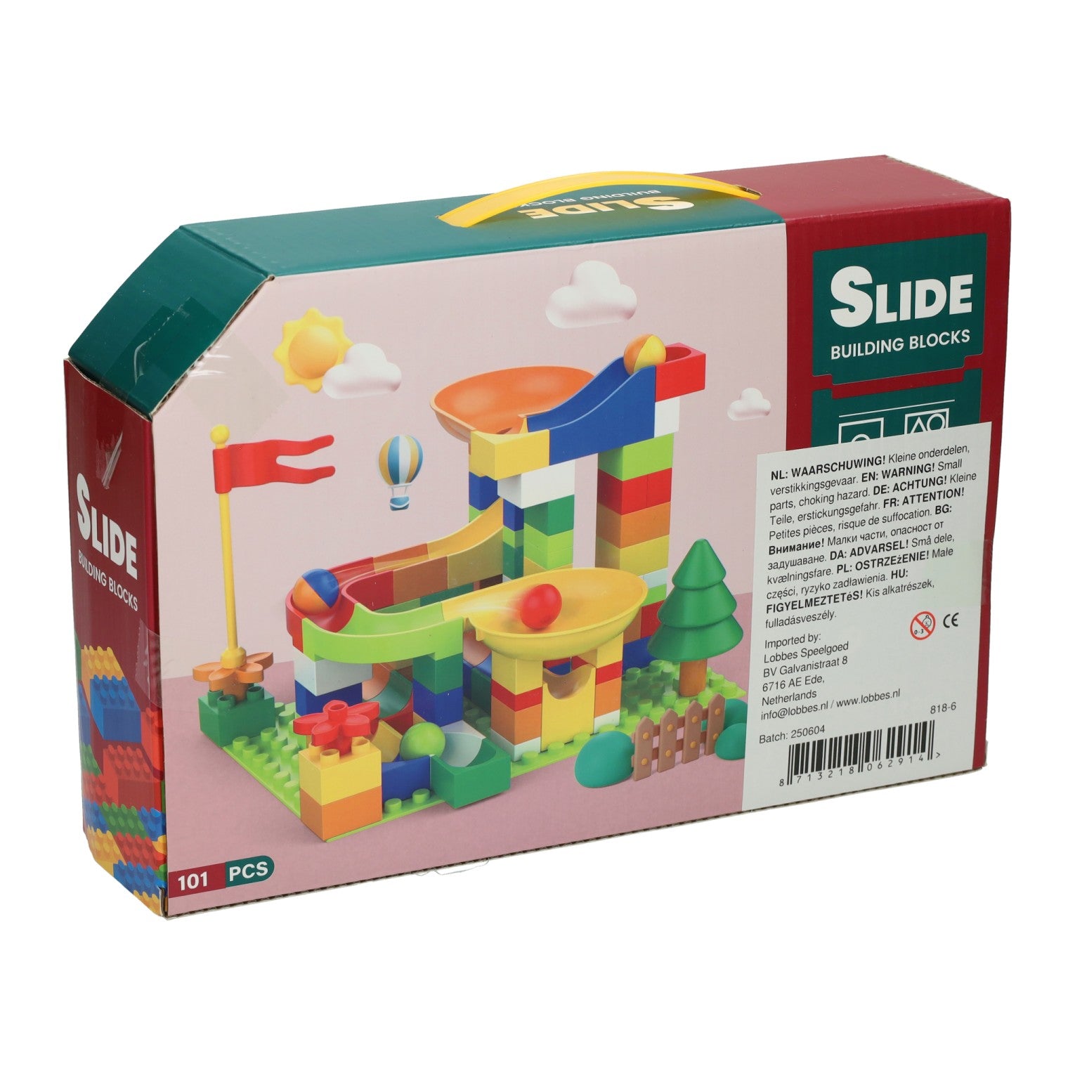 Knikkerbaan-bouwset van kunststof met 101 onderdelen, inclusief bouwplaat en knikkers. Wordt geleverd in stevige doos met handvat. Geschikt vanaf 3 jaar.