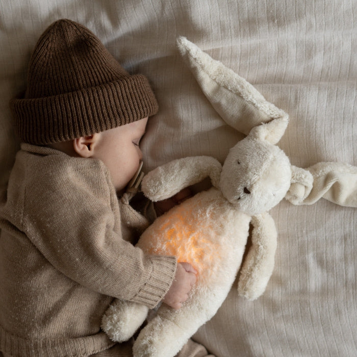 Deze superzachte knuffel Teddy van Moonie wordt ongetwijfeld de beste vriend van je baby. De knuffel is gemaakt uit heerlijk zacht organisch katoen en heeft 5 natuurlijke, kalmerende geluiden die een rustige slaap bevorderen. Daarnaast kan je kiezen uit 5 verschillende ledlichtjes die uit de buik van de knuffelbeer komen. Deze lichtjes doen je kleintje denken  aan  de veilige omgeving van de baarmoeder, stellen gerust en brengen tot rust.