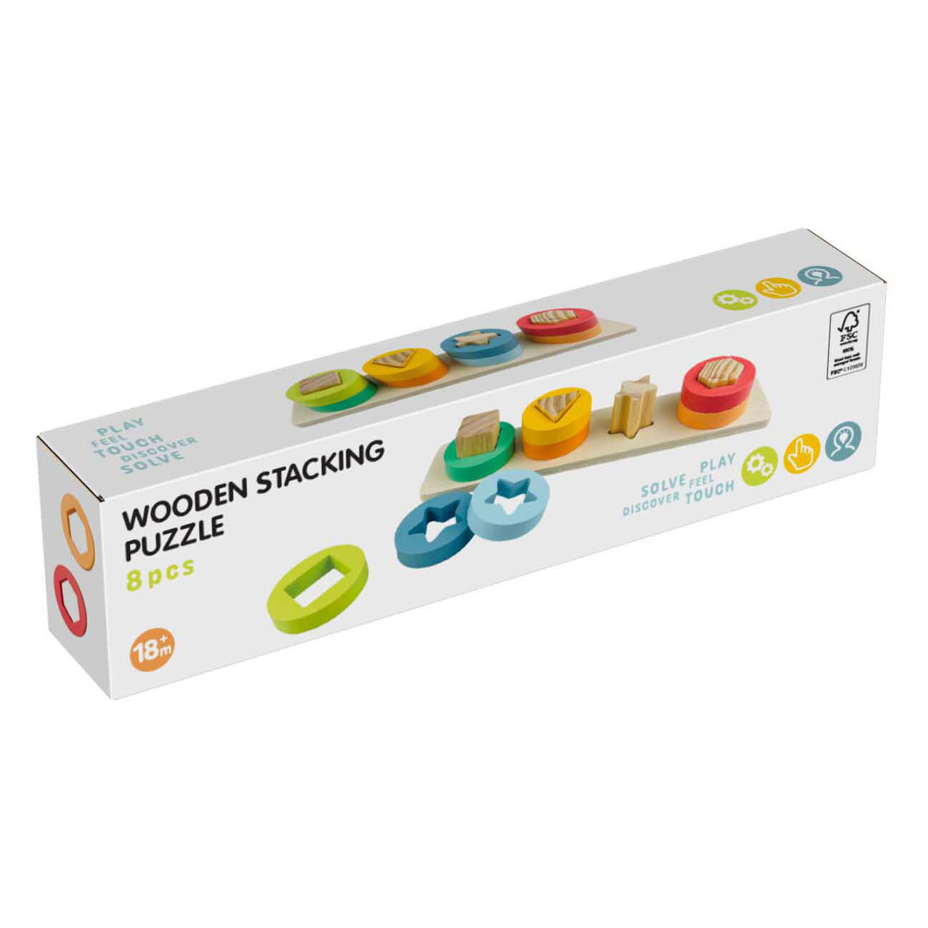 Houten stapelpuzzel met verschillende vormen, 9dlg. Geschikt voor dreumesen en peuters vanaf 18 maanden oud.