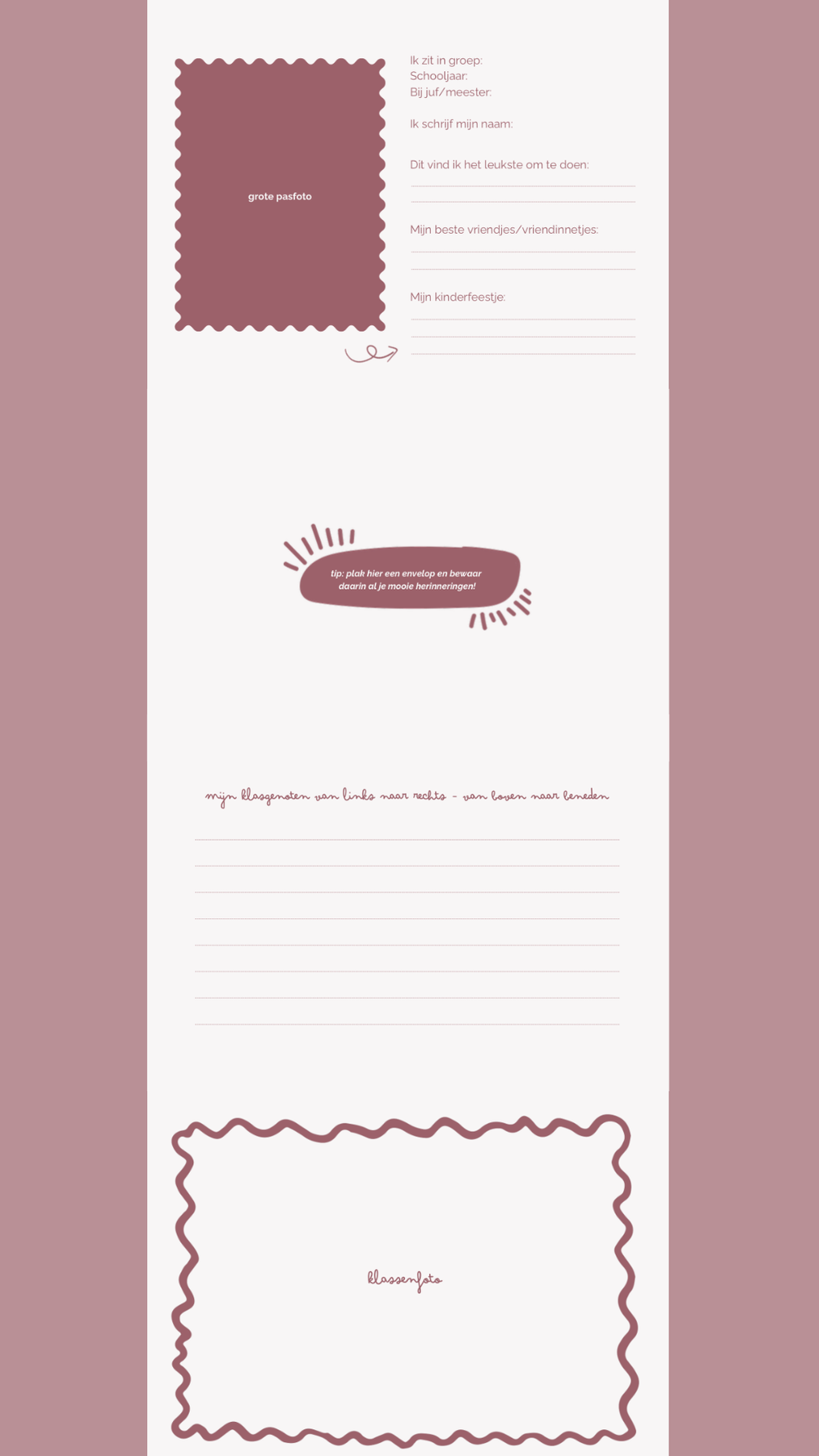 Per schooljaar is er ruimte voor de klassenfoto's, pasfoto's én voor de mooiste herinneringen gebundeld. Tip: schaf een envelop aan en bundel alles samen op één pagina.