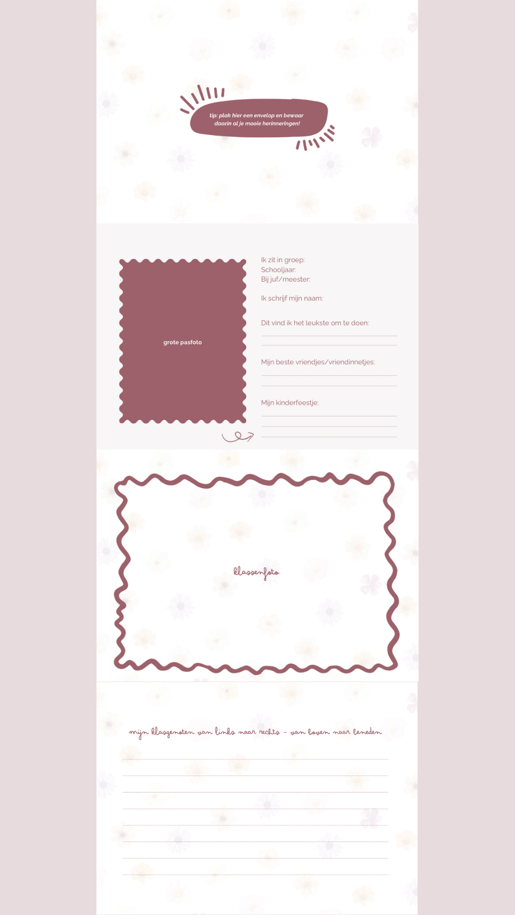 Per schooljaar is er ruimte voor de klassenfoto's, pasfoto's én voor de mooiste herinneringen gebundeld. Tip: schaf een envelop aan en bundel alles samen op één pagina.