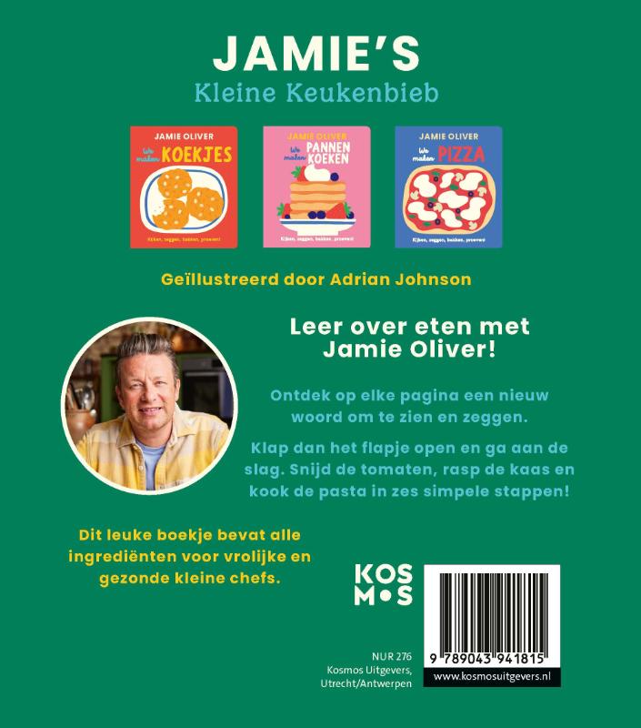 Met Jamie’s Kleine Keukenbieb ontdekken kinderen spelenderwijs de wereld van eten en koken. In vrolijke kartonboeken neemt Jamie Oliver de allerkleinsten mee in herkenbare recepten als pannenkoeken, pizza en pasta. Met flapjes, kleurrijke illustraties en stap-voor-stap uitleg leren kinderen nieuwe woorden, wordt hun nieuwsgierigheid naar eten gewekt en beleven ze plezier aan samen koken. Zo legt Jamie al jong de basis voor een gezonde relatie met voeding.
